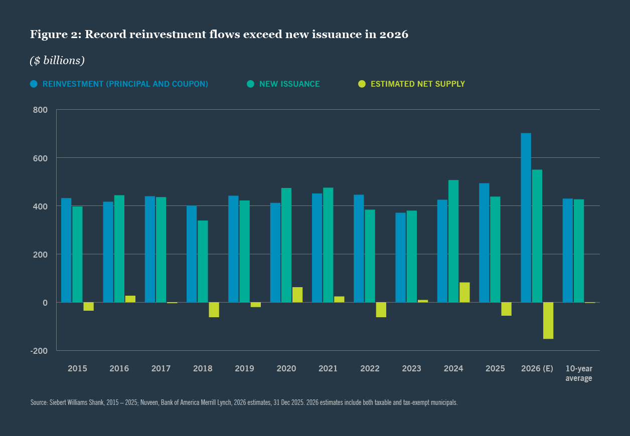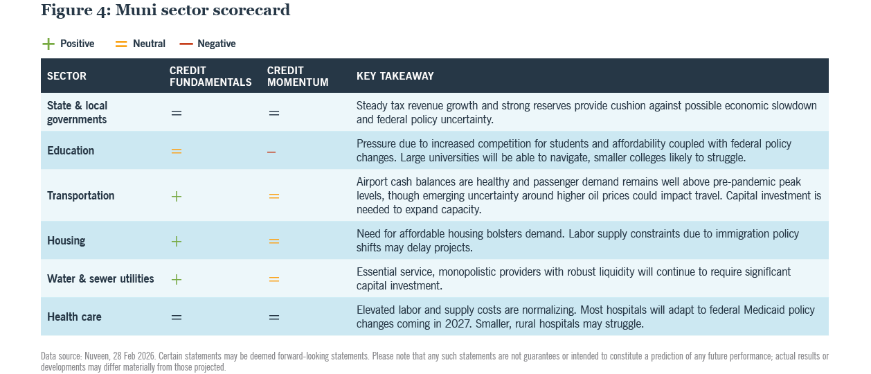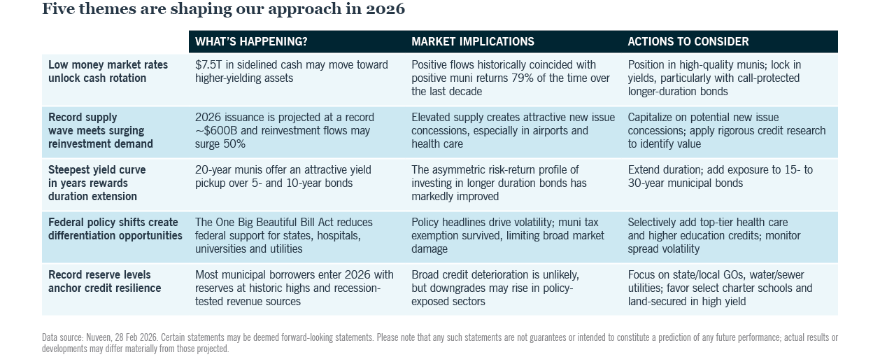 We expect demand to continue, supported by ample cash on the sidelines, high starting yields and solid municipal credit conditions. But recent headwinds are worth monitoring, stemming from geopolitical uncertainty and a U.S. Federal Reserve that appears content holding interest rates steady for 2026.