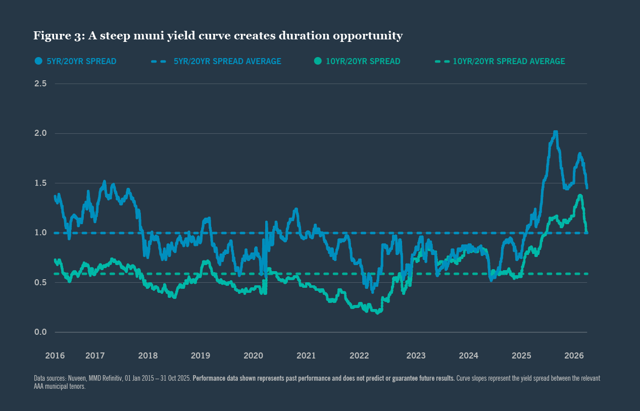 We suggest investors consider staying invested and use any short-term market dislocations as a tactical opportunity to add exposure at current valuations. The steep yield curve makes extending maturity profiles - particularly into 20-year-plus bonds - an effective way to capture additional yield and long-term value. Selective allocation to higher education and health care bonds may also reward patient investors, as sector-level policy concerns have driven spread widening that we believe overstates the fundamental credit risk in many of these issuers.